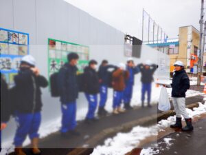 弊社担当{皆さんおはようございます!安全対策の為ヘルメット装着してください!